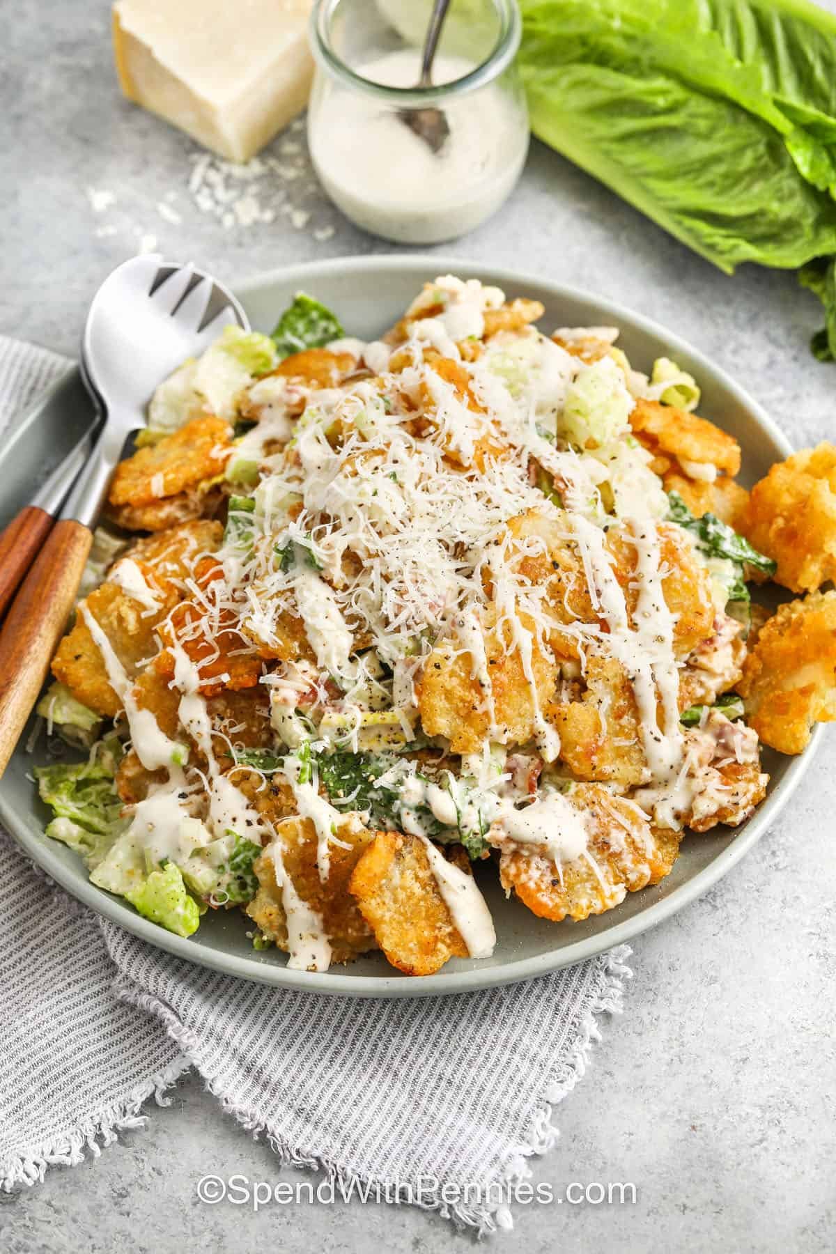 Smashed tater tots, blackened chicken, bacon bits, and crunchy veggies are tossed with romaine lettuce and Caesar dressing for a fun, fresh take on a classic salad! What is Crispy...